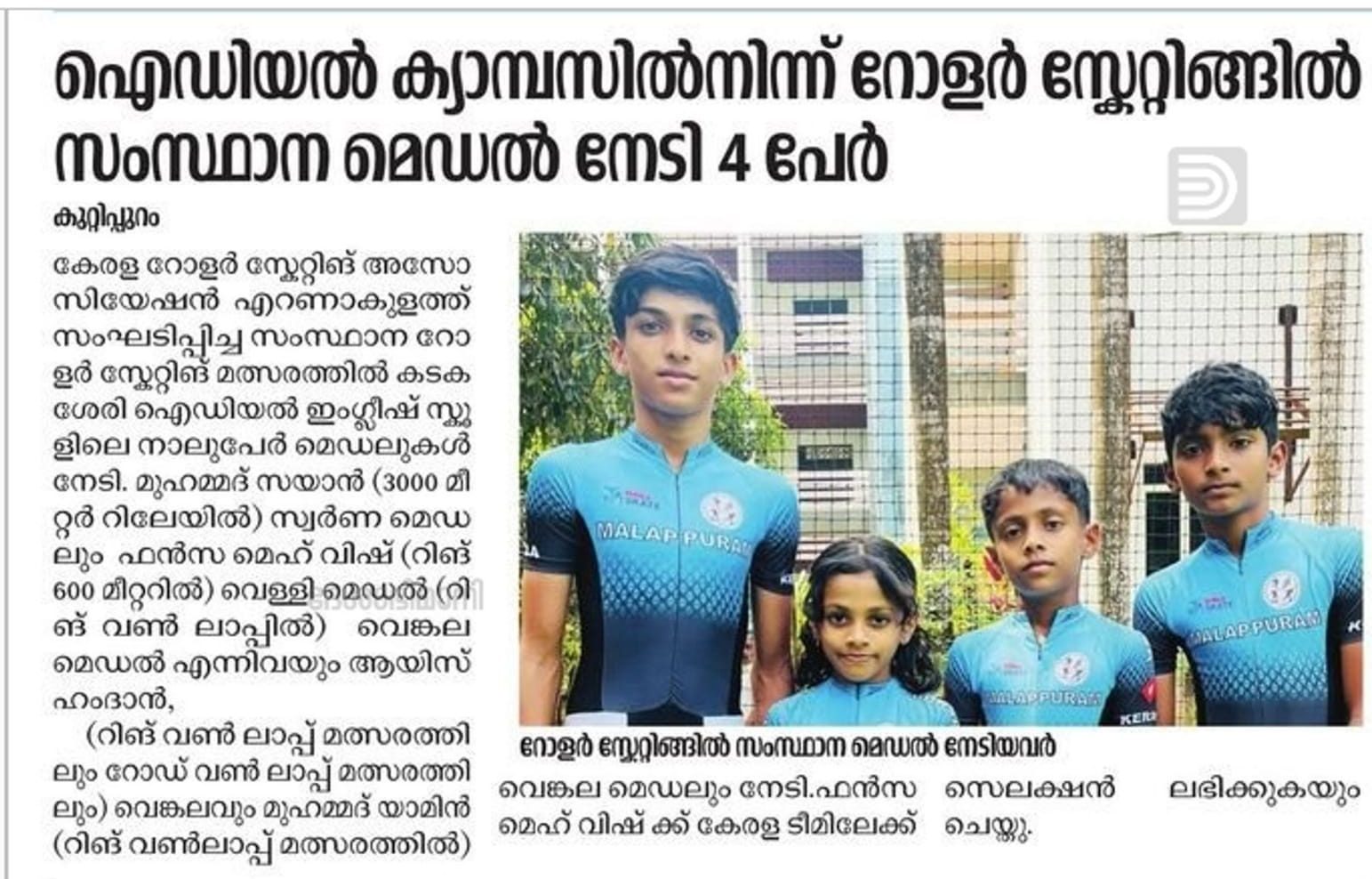 Four Students from Ideal Campus Win State Medals in Roller Skating Edappal: In the State