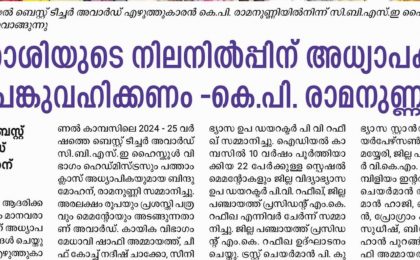Ideal Best Teacher Award to Bindu Mohanan Edappal: At the Kadakassery Ideal International Campus, the Best Teacher Award for the academic year 2024–25 was presented to Bindu Mohanan, Headmistress of