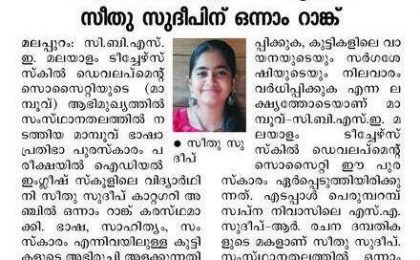 Malappuram: In the state-level Mampoov Language Talent Award examination conducted under the leadership of the CBSE Malayalam Teachers Skill Development Society (Mampoov), Sithu Sudheep, a student of