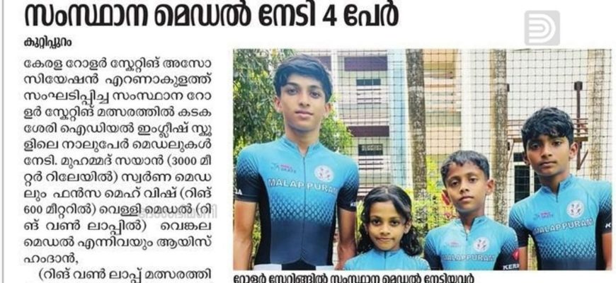 In the State Roller Skating Championship organized by the Kerala Roller Skating Association at Ernakulam, four students from Kadakassery Ideal English School won medals. Muhammed Sayan won a gold medal in the 3000-meter relay.