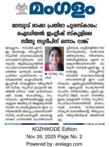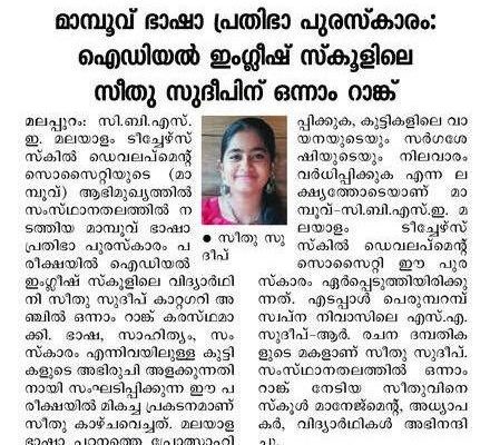 Malappuram: In the state-level Mampoov Language Talent Award examination conducted under the leadership of the CBSE Malayalam Teachers Skill Development Society (Mampoov), Sithu Sudheep, a student of Ideal English School, secured the first rank in Category 5.